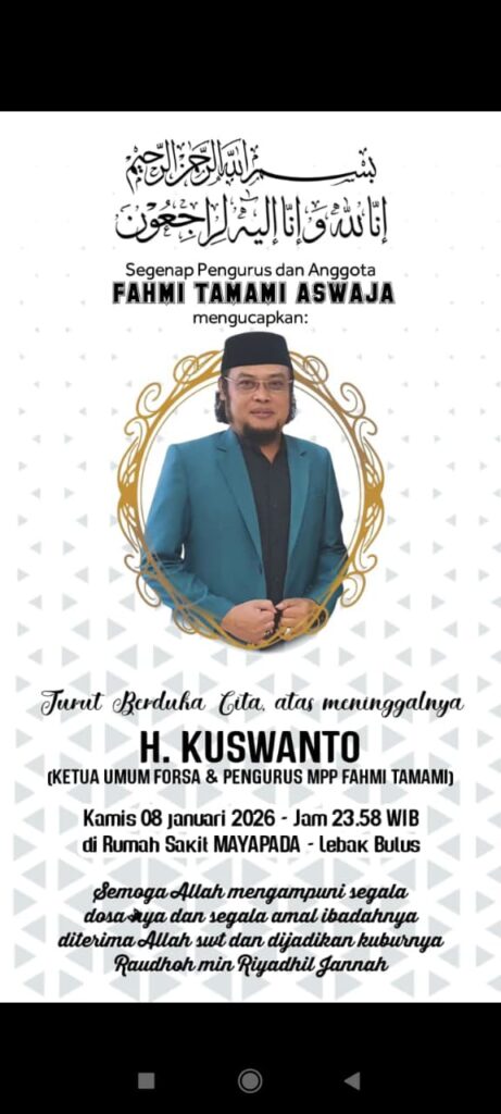 Atas nama redaksi Suarasoneta, kami menyampaikan belasungkawa yang sedalam-dalamnya atas wafatnya H. Kuswanto. Semoga almarhum mendapatkan tempat terbaik di sisi Allah SWT, diampuni segala khilafnya, dan seluruh amal baktinya dicatat sebagai kebaikan. Kepada keluarga yang ditinggalkan serta keluarga besar FORSA, semoga diberi ketabahan dan kekuatan dalam menghadapi masa duka ini.